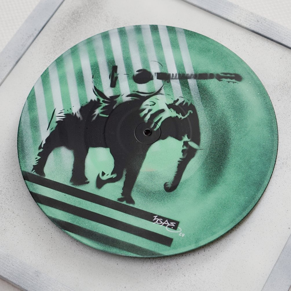 Eine freshe Schallplatte für deine Wand. Ein Elefant mit Gitarre, natürlich!